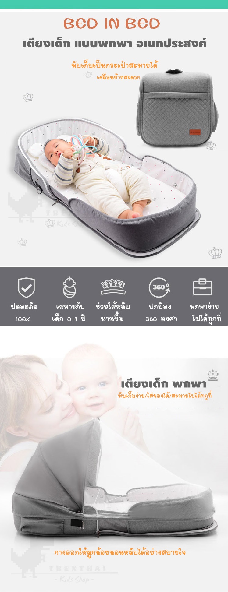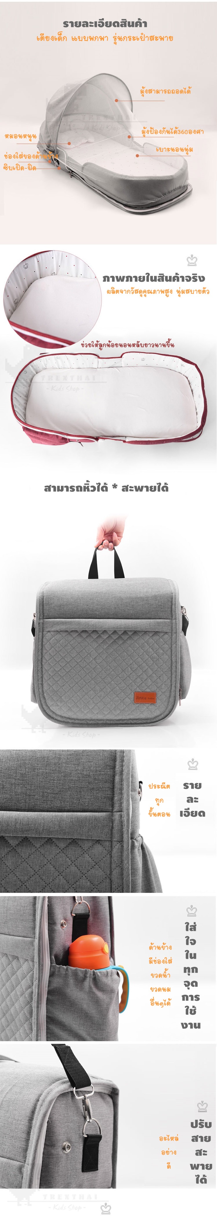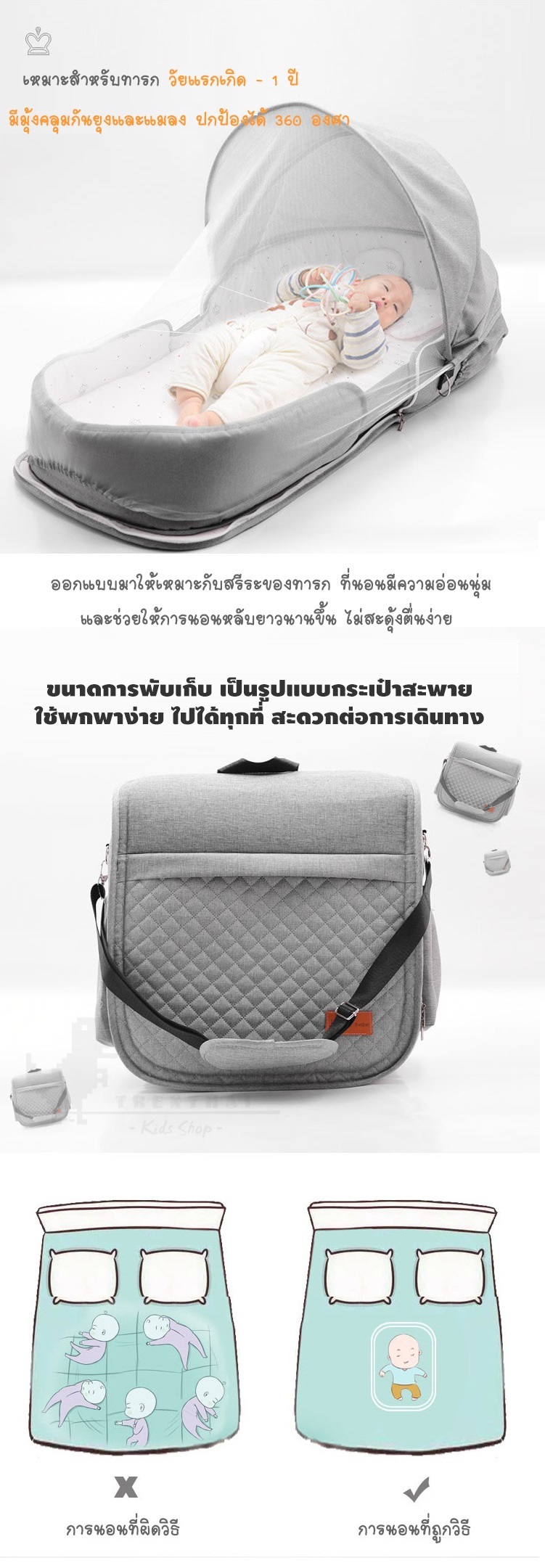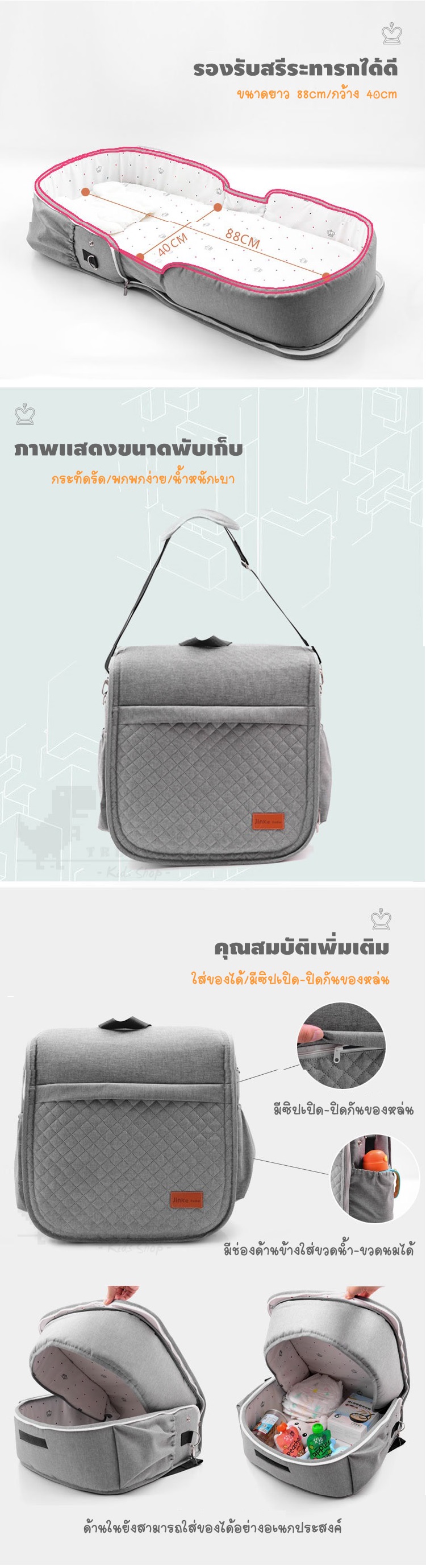 นอกจากเป็นที่นอนเด็กพกพาแล้ว ยังปรับเป็นกระเป๋าใส่อุปกรณ์ของเด็กได้อีกด้วย